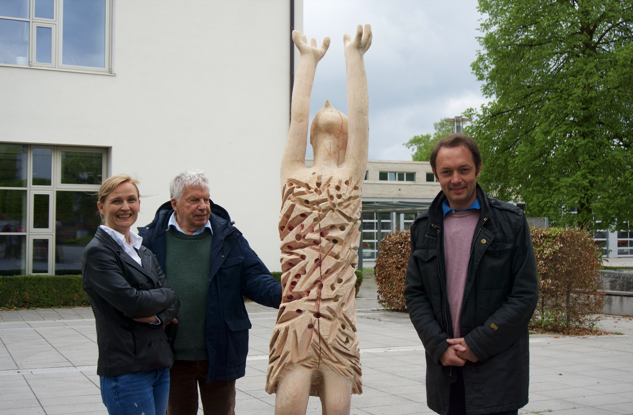 Geplant ist, dass die Skulptur für eine Woche auf dem Rathausplatz verankert bleibt. Die Aufstellung war eine sehr gelungene Blitzaktion des Kulturvereins mit kurzen und unbürokratischer Hilfe der Gemeinde. „Erst am Mittwoch den 4. Mai war Jürn Ehlers mit dem Vorschlag an den Kulturverein herangetreten“, schmunzelt Catharina Gaiselhart. „Und da war noch nicht einmal die Skulptur fertiggestellt“, wie der Künstler grinsend ergänzt. Eine Mail an den Bürgermeister, Anrufe bei den Herrschinger Bildhauern Manfred Pieler und Nikolai Holzach, die sofort ihre Bereitschaft signalisierten, beim Transport und der Verankerung auf einem Sockel zu helfen – sowie helfende Hände bei der Organisation der Installation. „Nicht die Bürokratie hatte hier ihr letztes Wort“, betonte Hans-Herman Weinen, der sich glücklich zeigte, dass der Rathausplatz für diese Figur zumindest eine temporäre Heimat bildet.