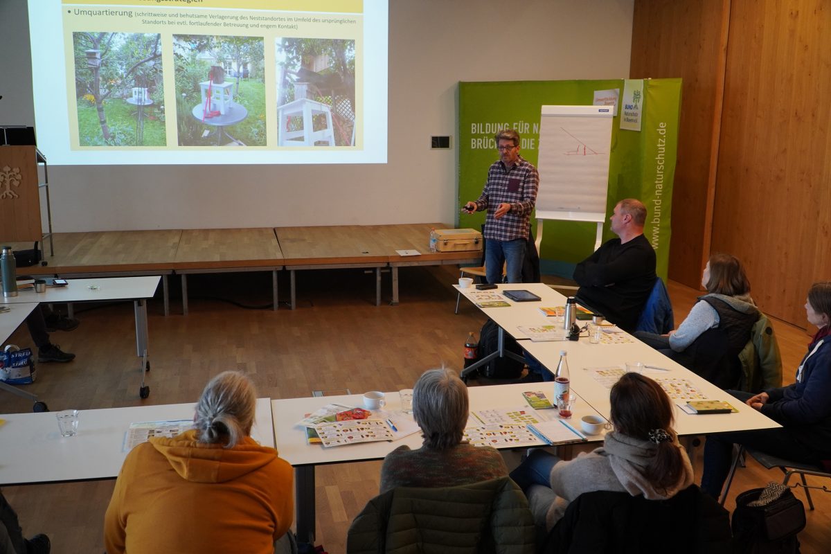 Ziel des Kurses war es, die Teilnehmenden für die praktische Arbeit als Wespen- und Hornissenberater*in auszubilden. Dazu gehören Kenntnisse in der Artbestimmung, der Biologie der Tiere und ihrer Ökologischen Bedeutung, ebenso wie der rechtliche Rahmen beim Umgang mit Wespen und Hornissen. Darüber hinaus wurden verschiedene Lösungen für Konfliktsituationen vorgestellt und diskutiert. Diese reichten von einer friedlichen Koexistenz im Freien, über Abschirmungsmaßnahmen der Tiere bis zu Umsetzungsmaßnahmen. Auch auf Gesprächsführung in der telefonischen Beratung wurde ein Fokus gelegt. Ausgezeichnet hat sich der Kurs vor allem durch einen hohen Anteil praktischer Übungen: So durften die Teilnehmenden Fallbeispiele von Konfliktsituationen diskutieren und Beratungsgesprächen simulieren, sowohl in Partnerarbeit als auch mithilfe von KI. Besonderen Eindruck haben auch die Anschauungsmaterialien hinterlassen, z.B. die Nester der gewöhnlichen Wespe, welche sich durch bemerkenswerte Bauleistung auszeichnen.